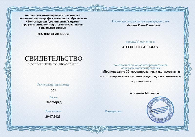Преподавание 3D-моделирования, макетирования и прототипирования в системе общего и дополнительного образования (144ч)