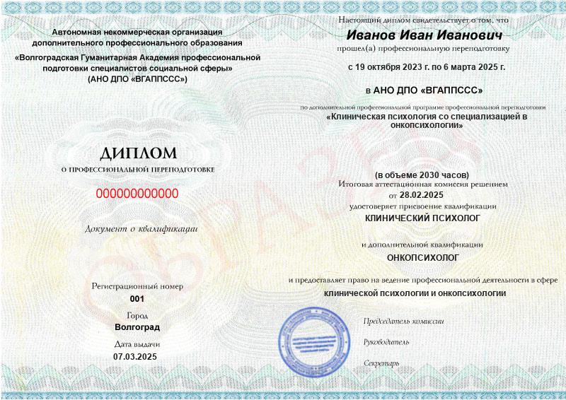 Обучение по такой программе – способ освоить новую профессию на основе ранее полученного образования. В дипломе выпускника указывается его ФИО, наименование учебной организации, название и длительность программы. Документ заверяется подписью руководителя и печатью АНО ДПО «ВГАППССС».
